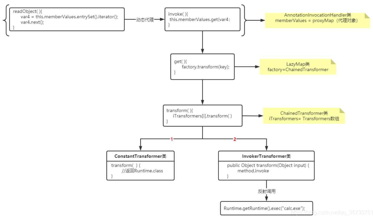 - 调用链:transform能够被LazyMap的get方法进行调用,LazyMap链的调用是通过AnnotationInvocationHandler类的动态代理实现的,在handler的反序列化readObject中,会调用到memberValues的方法,memberValues设置为LazyMap的实例,因为挂了一层动态代理,所以会调用到LazyMap的invoke方法,invoke方法中调用了memberValues的get方法,接着调用transform,形成调用链。