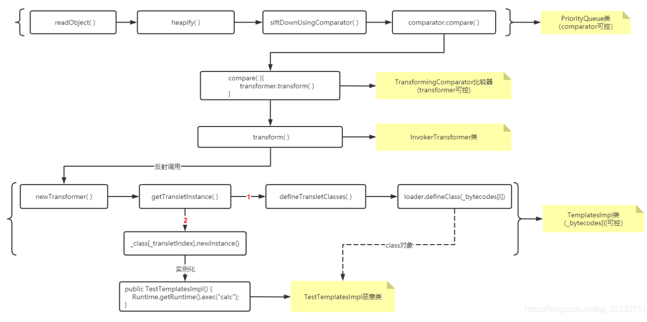 3. 通过反射构造PriorityQueue队列的comparator和queue两个字段,将PriorityQueue队列的comparator字段设置为TransformingComparator,然后将queue字段设置为TemplatesImpl对象,触发利用链