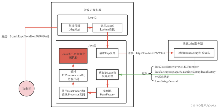 1、攻击者发送带有恶意Ldap内容的字符串,让服务通过log4j2打印